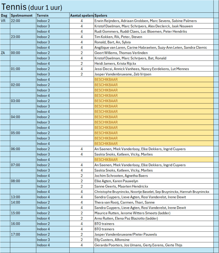 - Wij streven ernaar dat er minstens op 2 tennisterreinen, gedurende 24 uur, getennist wordt. Voor padel gaan wij voor 24 uur op minstens 1 padelterrein.