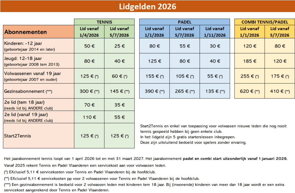 - mogelijkheid tot deelnemen aan activiteiten van Tennis Vlaanderen (interclub, tornooien, klassement, …)